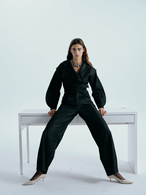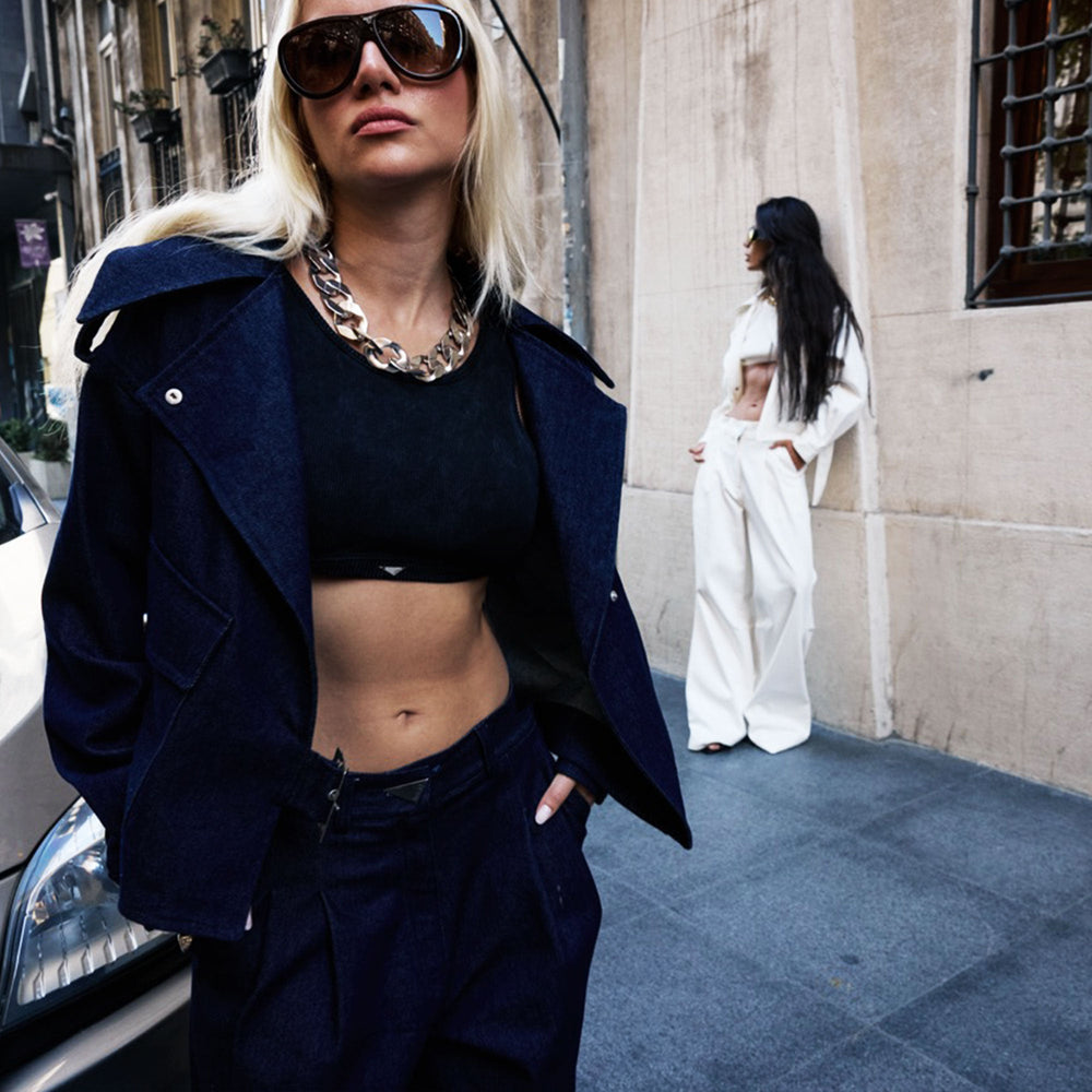 The MAGIA jacket takes on a new attitude in denim—crafted with a dramatic oversized fit and defined tailoring. Its sharp silhouette is enhanced by structured shoulders, wide lapels, and polished tone in tone buckles that punctuate the look with utilitarian edge. Distinctive hardware details and reinforced seam finishes give it a modern, almost architectural quality, while its deep indigo tone keeps it grounded. A statement piece that blurs the line between street and refined, and elevates any casual styling.