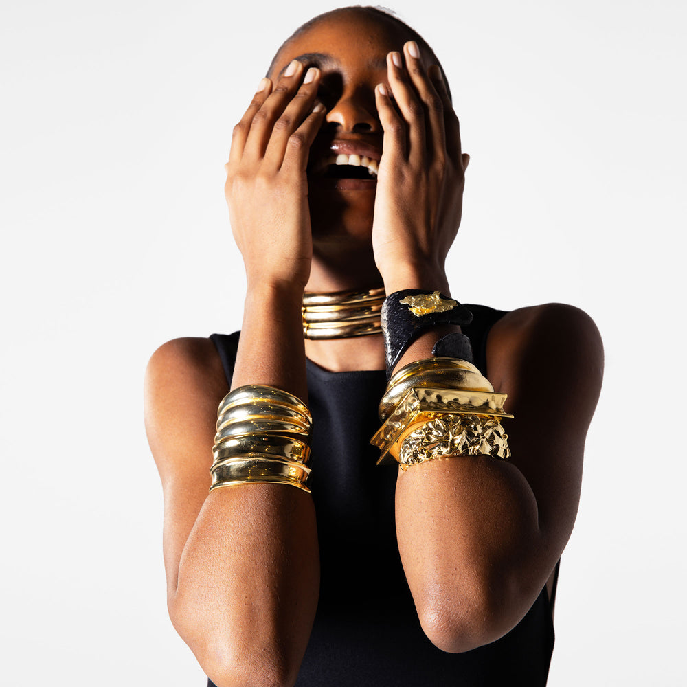 Sculptural by nature, sensual in presence—the Amora Cuff Necklace is a study in bold elegance. Crafted from polished gold-plated brass and designed with a series of fluid, stacked curves, it wraps the neck like armor softened by intention. Wear it solo for a fearless statement or contrast its gleam with minimalist silhouettes.